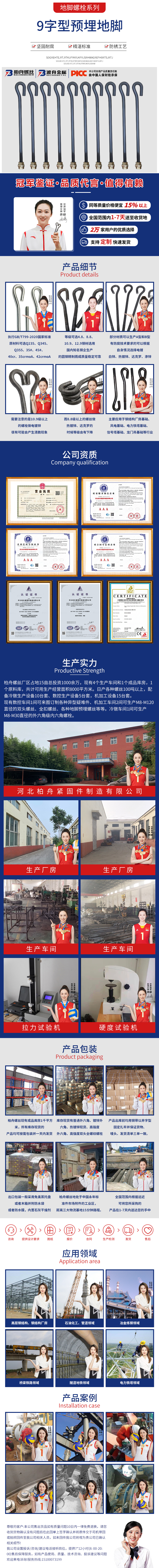 產(chǎn)品介紹:柏舟9字地腳螺栓執(zhí)行GB T799-2020國家標(biāo)準(zhǔn),是地腳螺栓唯一執(zhí)行標(biāo)準(zhǔn)。原材料可選Q235、Q345、Q355、35 、45 、40cr、35crmoA、42crmoA,等級(jí)可選4 8、8 8、10 9、12 9。鋼材選用國內(nèi)知名鋼企生產(chǎn)的圓鋼精制而成,質(zhì)量穩(wěn)定可靠,地腳螺栓部分材質(zhì)可以生產(chǎn)A型和B型。有防腐技術(shù)要求的可以根據(jù)自身情況選擇電鍍白鋅、熱鍍鋅、達(dá)克羅、滲鋅。主要應(yīng)用于等需要預(yù)埋的行業(yè)。
