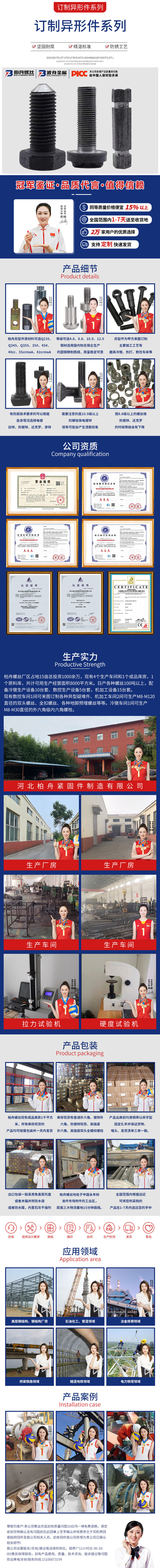 產(chǎn)品介紹: 柏舟異型件原材料可選Q235、Q345、Q355、35 、45 、40cr、35crmoA、42crmoA,等級(jí)可選4 8、8 8、10 9、12 9。鋼材選用國(guó)內(nèi)知名鋼企生產(chǎn)的圓鋼精制而成,質(zhì)量穩(wěn)定可靠。異型件為甲方來(lái)圖訂制,主要加工工藝有磨具冷鐓、熱打、數(shù)控車床等。有防腐技術(shù)要求的可以根據(jù)自身情況選擇電鍍白鋅、熱鍍鋅、達(dá)克羅、滲鋅,需要注意的是10 9級(jí)以上的螺栓做電鍍鋅很有可能會(huì)產(chǎn)生清脆現(xiàn)象。