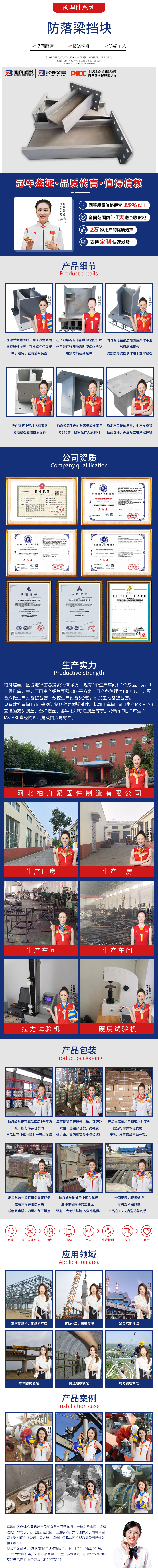產(chǎn)品介紹:柏舟公司生產(chǎn)的防落梁較多采用Q345的一級鋼板作為原材料以確定產(chǎn)品的整體質(zhì)量??缮a(chǎn)支座鋼板預(yù)埋件、聲屏障立柱預(yù)埋件、接觸網(wǎng)預(yù)埋件、固定墩等相關(guān)產(chǎn)品。較多采用多元合金共滲+鈍化+封閉和熱鍍鋅的表面防腐處理工藝,熱鍍鋅鋅層厚度可達(dá)80um以上。防落梁擋塊的概述: 在遭受大地震時,為了避免防落梁災(zāi)難性損壞,在橋梁構(gòu)造設(shè)施中,通常設(shè)置防落梁裝置。
